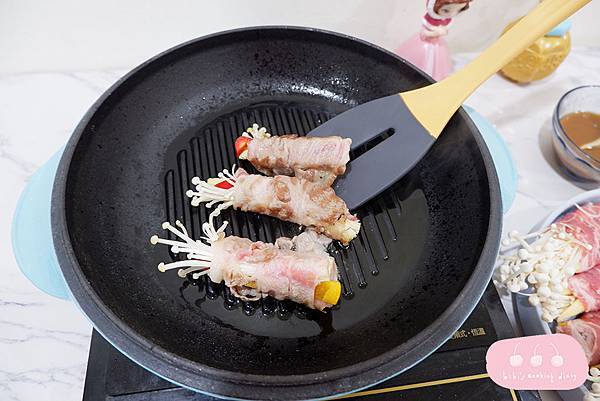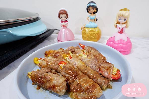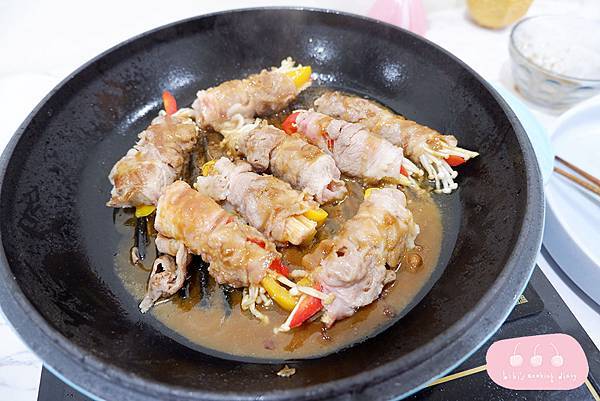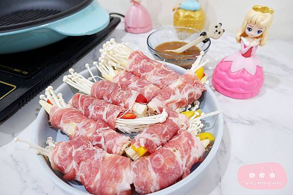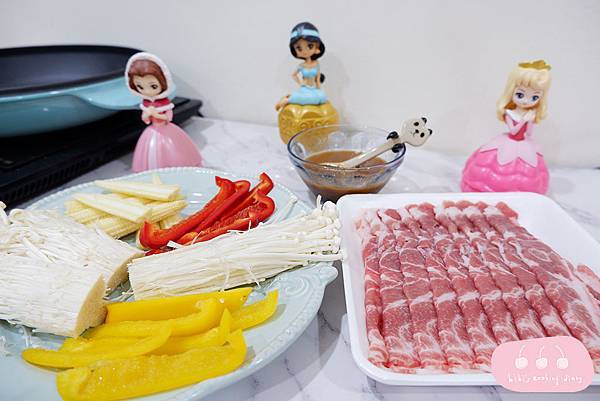 食材:梅花肉片、金針菇、紅黃甜椒、玉米筍