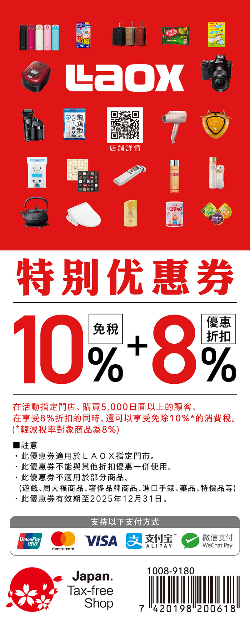 Laox是目前日本國內最大規模的大型免稅店,除了藥妝、電器、食品之外,還有許多精品品牌以及更多樣化的化妝品。