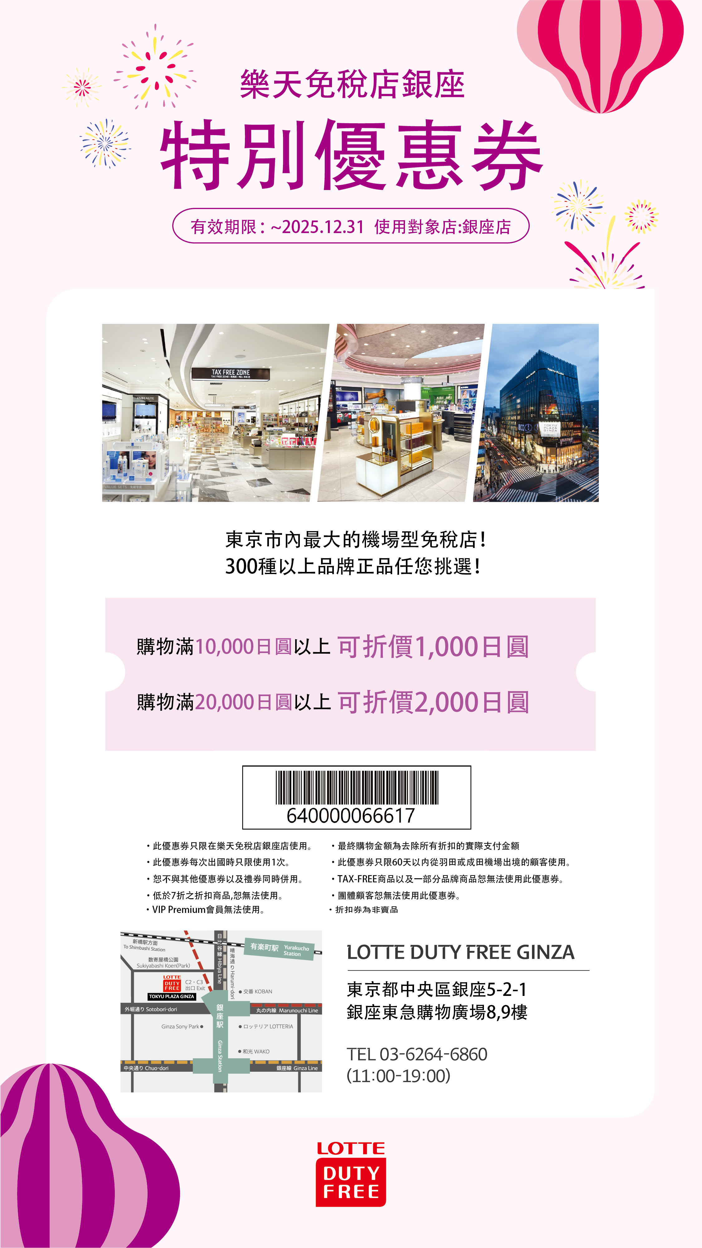 消費滿指定日圓,結帳時出示本優惠券、護照,除了 10%免稅外,還享有額外折扣及精美贈品。