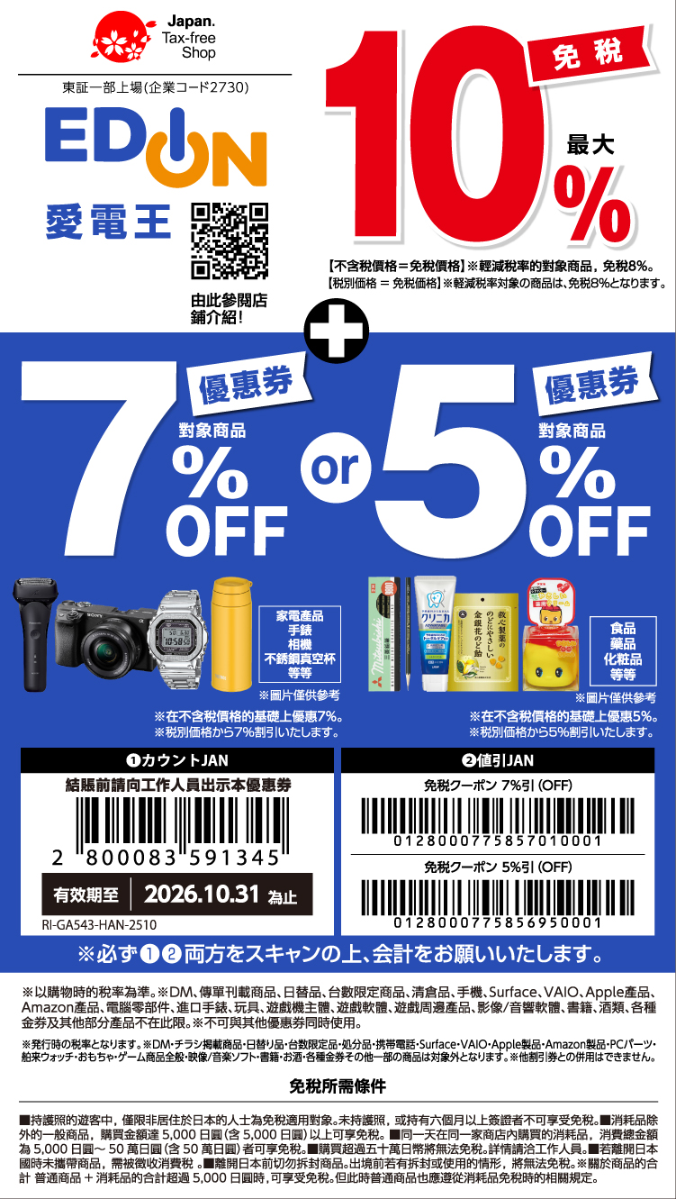 消費滿 5,000 日圓,結帳時出示本優惠券、護照,即可免稅 10%、並依購買的商品類別,再額外折抵消費稅 3% 或 7%。