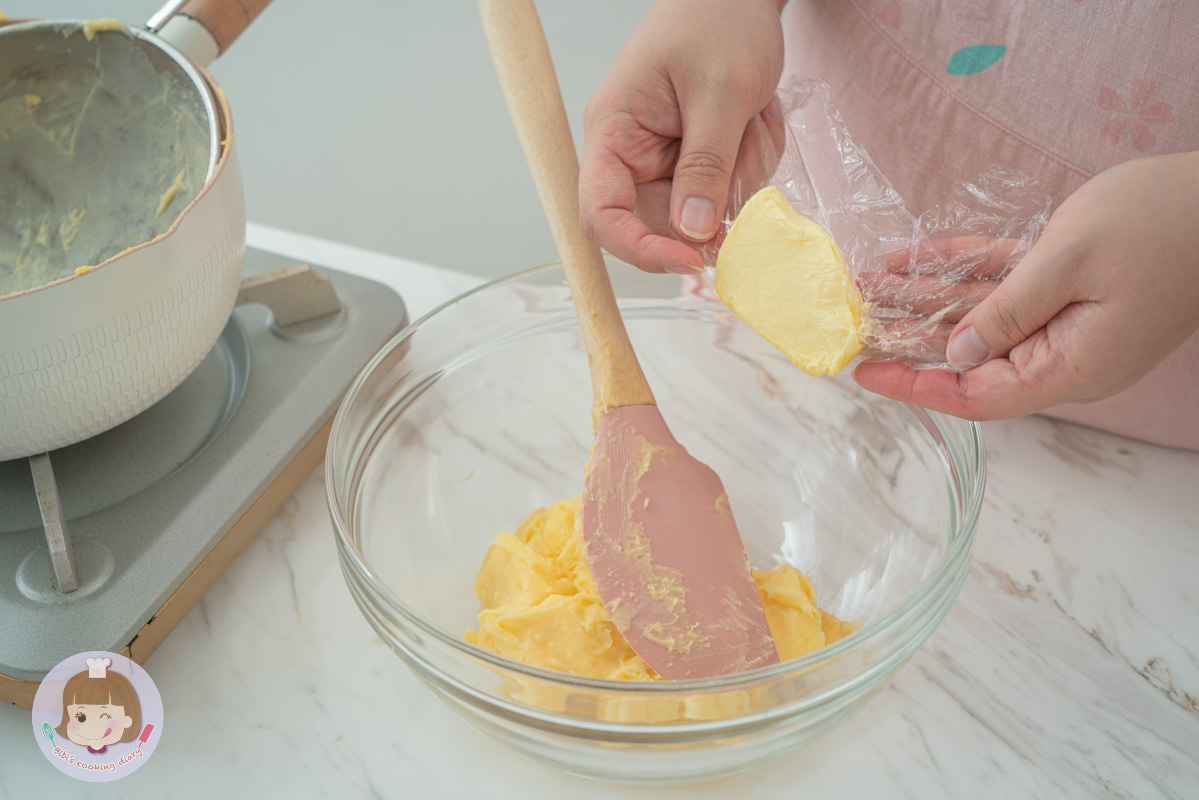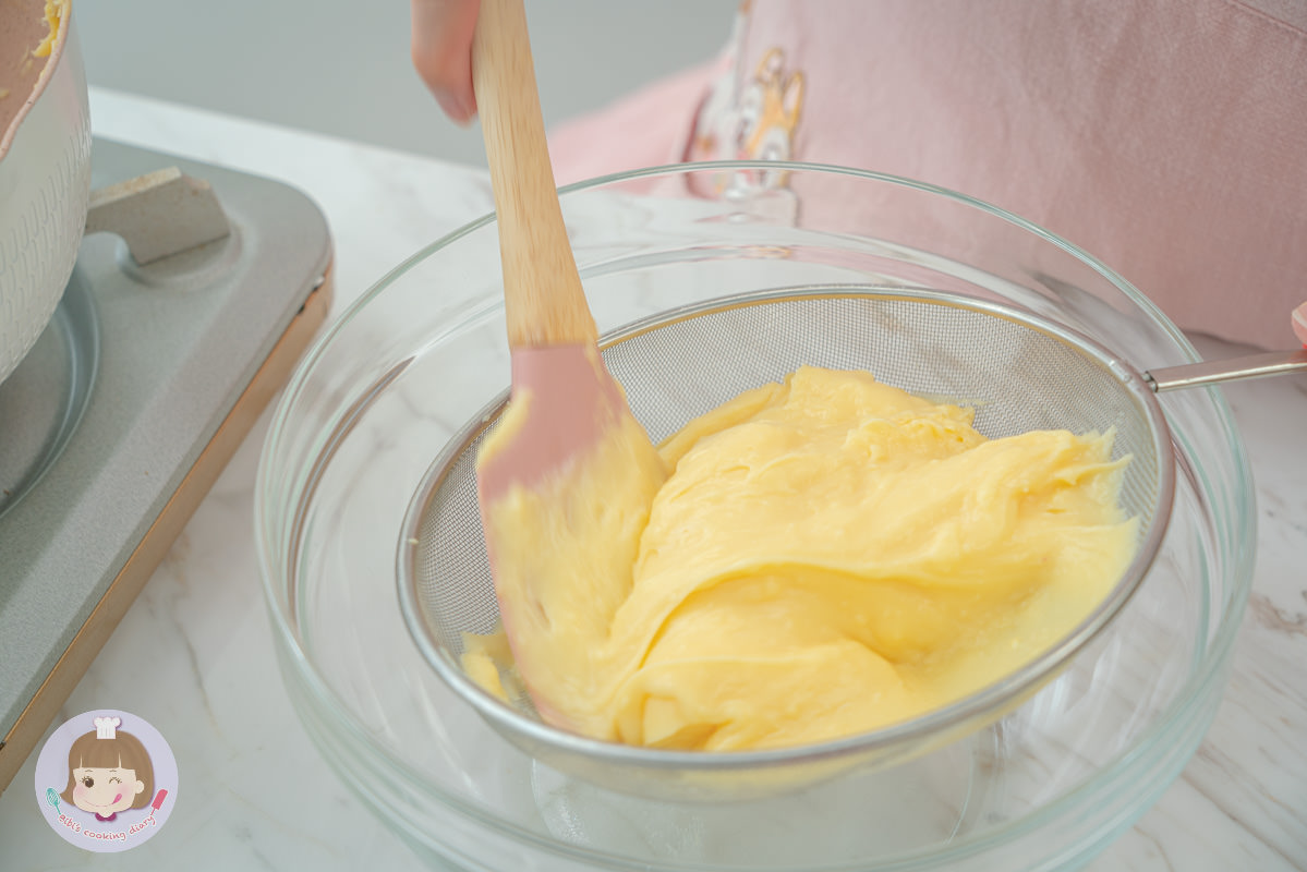 4.若卡士達醬有結塊可過篩,過篩後加入奶油攪拌至均勻