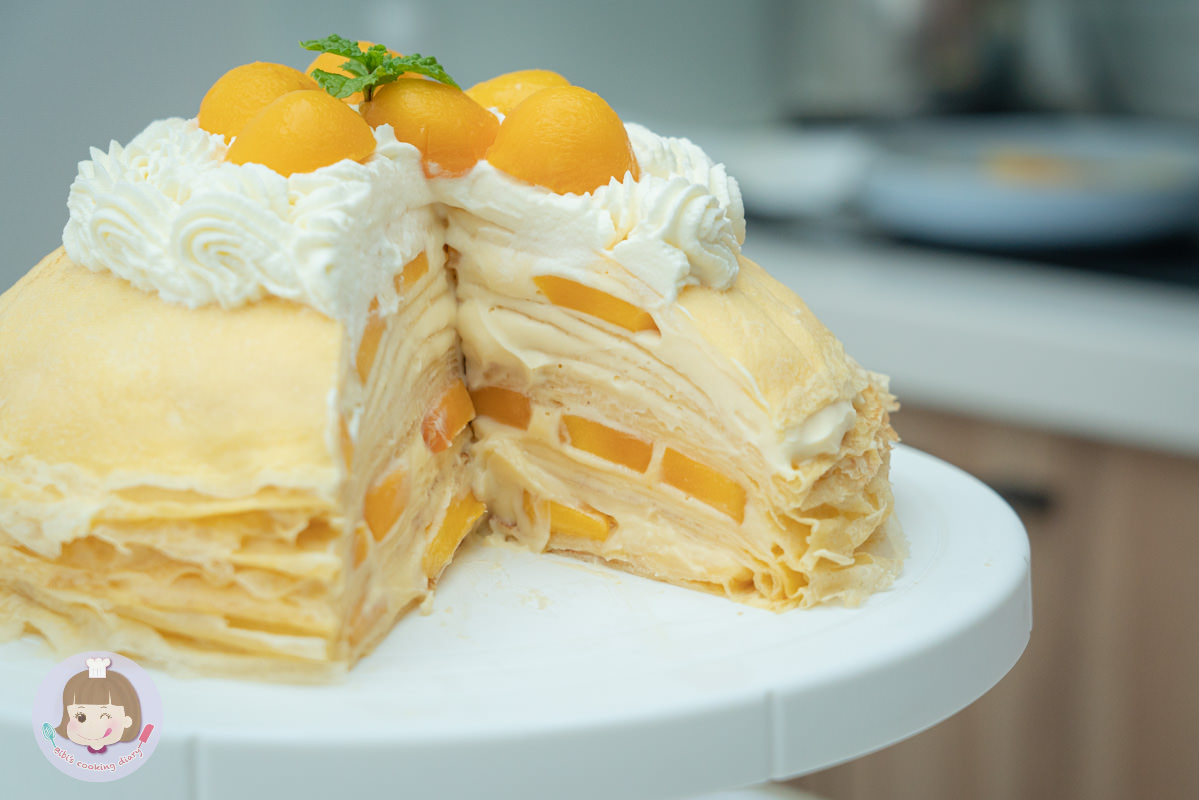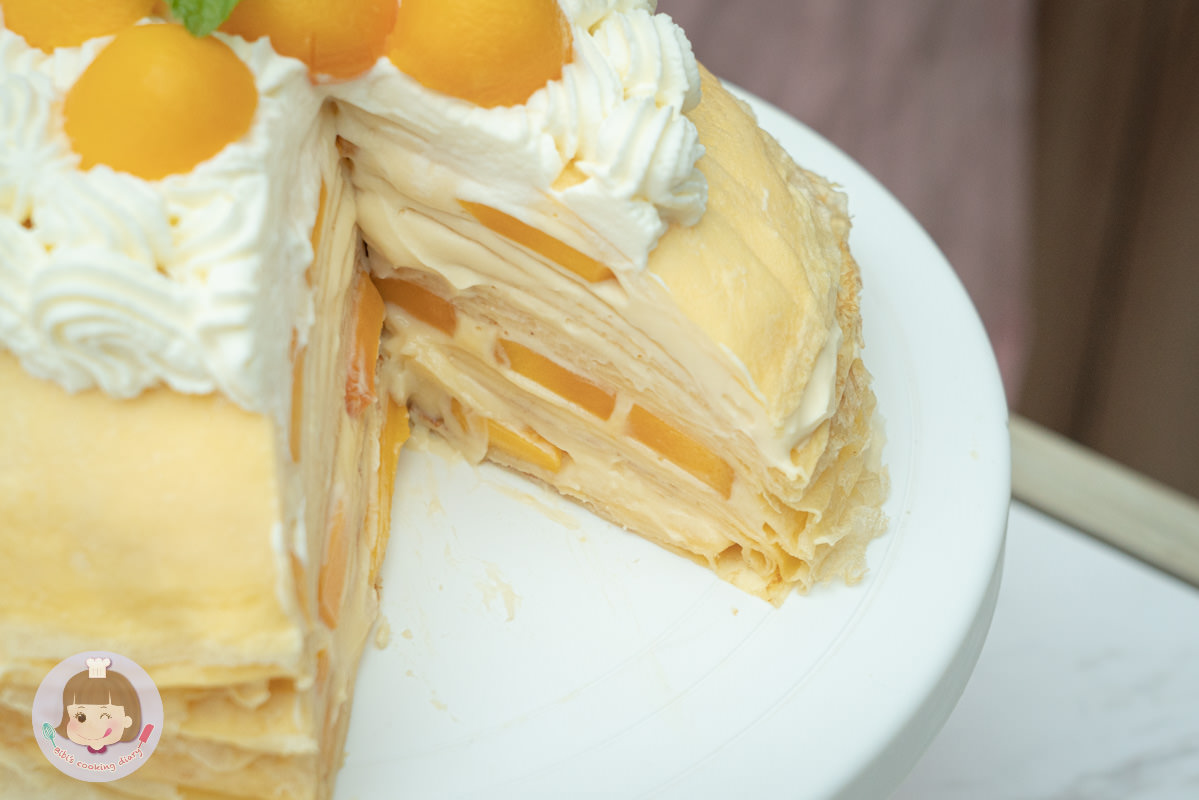 2.夾層加入芒果後,再抹上卡士達鮮奶油醬才能放上餅皮,否則黏不住會分離