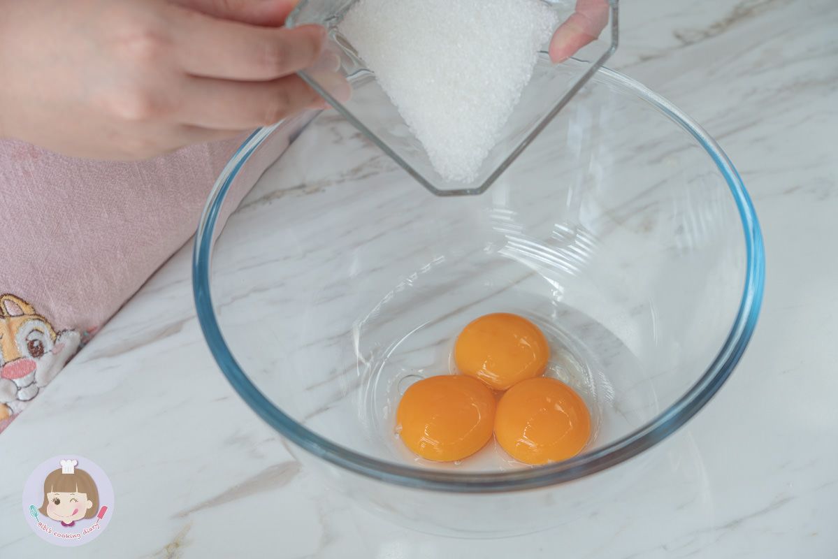 1.3顆蛋黃加入砂糖,打發至乳黃色後加入過篩的低筋麵粉+玉米粉,攪拌均勻